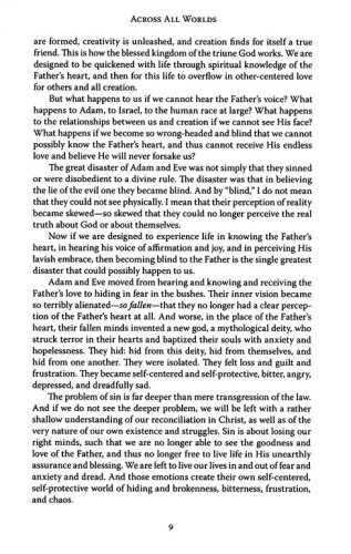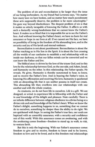 Jesus Christ is not a theoretical idea or a mere concept far removed from our human experience. In Across All Worlds, Baxter Kruger brings us face to face with the fact that Jesus has established a very real and personal relationship with us in our darkness. Jesus accepts us and walks with us because he is determined that we come to know His Father with him and life in His embrace.