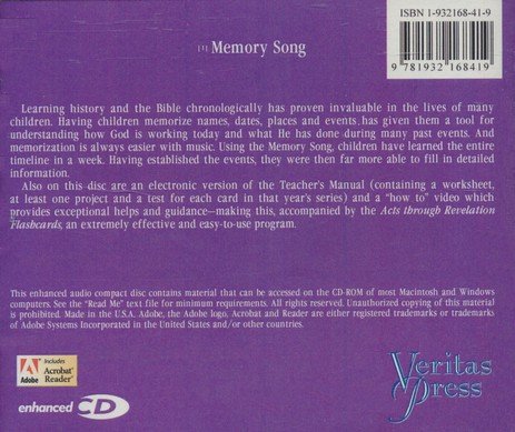This enhanced CD for the Veritas Press Bible Series Acts through Revelation includes not only memory song tracks, but also an electronic version of the Teacher's Manual (which includes a worksheet, at least one project, and a test for each card in that year's series) and a "how to" video which provides helps and guidance. Content covers the work of the Apostles, the spread of the Gospel, Paul's writings, and the struggles of the early Church. Enhanced materials are in adobe acrobat format and can be accessed on the CD-ROM of most Macintosh and Windows computers. Grade 6.