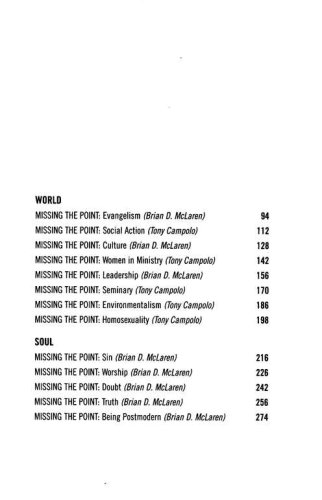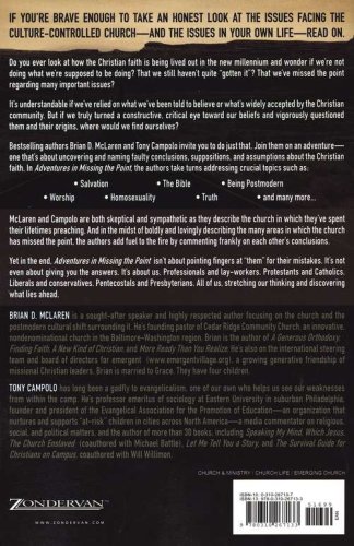 How the Culture-Controlled Church Neutered the Gospel If you’re brave enough to take an honest look at the issues facing the culture–controlled church—and the issues in your own life—read on. Do you ever look at how the Christian faith is being lived out in the new millennium and wonder if we’re not doing what we’re supposed to be doing? That we still haven’t quite “gotten it”? That we’ve missed the point regarding many important issues? It’s understandable if we’ve relied on what we’ve been told to believe or what’s widely accepted by the Christian community. But if we truly turned a constructive, critical eye toward our beliefs and vigorously questioned them and their origins, where would we find ourselves? Best-selling authors Brian McLaren and Tony Campolo invite you to do just that. Join them on an adventure—one that’s about uncovering and naming faulty conclusions, suppositions, and assumptions about the Christian faith. In Adventures in Missing the Point, the authors take turns addressing how we’ve missed the point on crucial topics such as: salvation, the Bible, being postmodern, worship, homosexuality, truth, and many more.