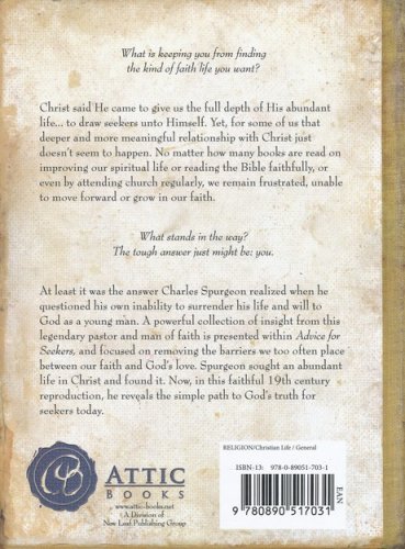 In Advice for Seekers, legendary pastor and man of faith Charles Spurgeon offers timeless wisdom for those who have gotten lost in their faith walk by using the map of their own understanding rather than the guidance of God. This powerful collection of insights focuses on removing the barriers we too often place between our faith and God's love. Spurgeon sought an abundant life in Christ and found it. Now, in this faithful 19th century reproduction, he helps set the seeker on the true path of God's truth, encouraging them to discover wisdom and blessings from the never-ending wellspring of God's mercy.