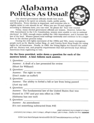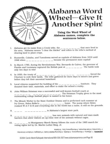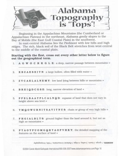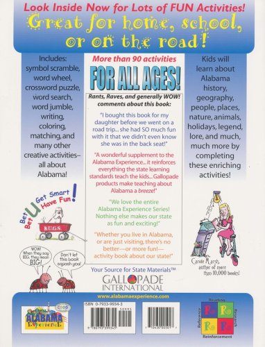 Whether you're visiting a new state or starting a state studies course, The Big Alabama Reproducible Activity Book will fulfill your wishes for a fun and educational way to learn state facts! Featuring worksheets on Alabama's history, geography, famous people, places, legends, and much more, you'll get a thorough introduction to what makes this state unique. Crosswords, dot-to-dots, mazes, coloring, word jumbles, writing, hidden pictures and other fun activities will make your students want to learn more and more. Great for review and research! 96 reproducible pages, softcover. Answers are printed upside down at the bottom of the page. Activities range in difficulty; Grades K-5.