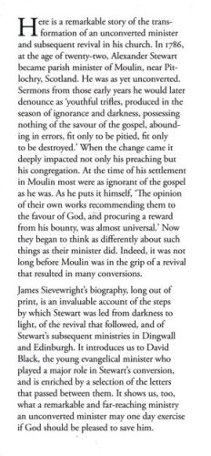 In 1786, at just twenty-two years old, Alexander Stewart became the parish minister of Moulin, near Pitlochry, Scotland, despite being unconverted. His early sermons, which he later condemned as "youthful trifles" full of errors, stood in stark contrast to the life-changing gospel he would later embrace. James Sievewright's biography, long out of print, chronicles Stewart's powerful journey from spiritual darkness to light, detailing the revival that followed in Moulin, the role of evangelical minister David Black in Stewart's conversion, and his subsequent ministries in Dingwall and Edinburgh. Through Stewart's transformation, this account highlights the profound impact an unconverted minister can have when God brings them to salvation, changing not only their life but their congregation's as well.