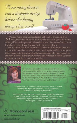 It’s taken Audrey Regan years to establish herself as a wedding dress designer, and to date she’s been roped into creating dresses for nine of her girlfriends. Request #10 follows her vow to “Just say no!” and comes from her very best friend. She can hardly turn Carly down!          Audrey arrives in Atlanta early to perform all of her maid-of-honor duties along with final fittings for a one-of-a-kind dress. But Carly’s wedding is nothing short of an event, complete with Prince Charming, and the festivities make Audrey question whether there’s a prince of her own anywhere in her future.   Enter the groom’s brother and best man. Shaggy-haired, tattooed bad boy J.R. Hunt couldn’t be any more different from Prince Charming if he rode in on a Harley Davidson.  Oh, wait. He actually did ride in on a Harley! "Sandra D. Bricker is the Babe Ruth of romantic comedy with one home run after another! Third in the hilarious series, I didn't want Always the Designer, Never the Bride to end.  I'm anxiously waiting for the next book in this series. Novel Rocket and I give Always the Designer, Never the Bride our highest recommendation. It's a 5-star read!" – Ane Mulligan, Sr. Editor Novel Rocket "Sandie Bricker's latest romance is as beautifully woven as a haute couture gown. Always the Designer, Never the Bride offers readers a fun and engaging storyline, along with some sparkling embellishments, including an array of bridal design tidbits, guaranteed to have you reaching for your needle and thread. Highly recommended!" – Janice Thompson, author of the Weddings by Bella series "Always the Designer Never the Bride shows yet another angle of the journey from 'I think I love you' to 'I do' and all the side adventures that keep her readers begging, 'Tell me another story!'"   Cynthia Ruchti, radio personality and novelist, author of the Carol Award finalist They Almost Always Come Home "Sandra Bricker has done it again! Like every book in this series, Always the Designer, Never the Bride made me laugh, made me sigh, made me root for the heroine, and made me cry. When I reached the last page, I didn't know whether to whimper because I had to leave Audrey and J.R. behind…or exhale that sigh of satisfaction bornof reading a truly wonderful story. No way I'm loaning this one out, because <gasp> what if it isn't returned!" – Loree Lough, best-selling author of more than 80 award-winning books, including reader favorite From Ashes to Honor