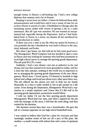 Here, then, is a truly American success story—a great and inspiring one. From modest beginnings as the son of a shoe salesman in Tampico, Illinois, Ronald Reagan achieved first a distinguished career in Hollywood and then, as governor of California and as president of the most powerful nation in the world, a career of public service unique in our history.