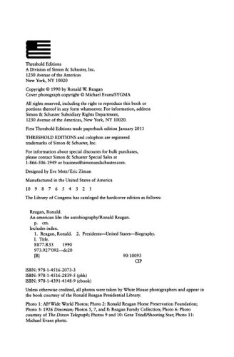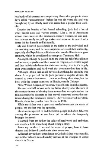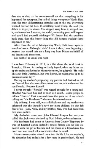 He tells us, with warmth and pride, of his early years and of the elements that made him, in later life, a leader of such stubborn integrity, courage, and clear-minded optimism. Reading the account of this childhood, we understand how his parents, struggling to make ends meet despite family problems and the rigors of the Depression, shaped his belief in the virtues of American life—the need to help others, the desire to get ahead and to get things done, the deep trust in the basic goodness, values, and sense of justice of the American people—virtues that few presidents have expressed more eloquently than Ronald Reagan.