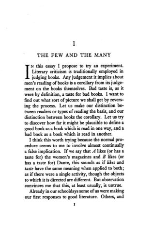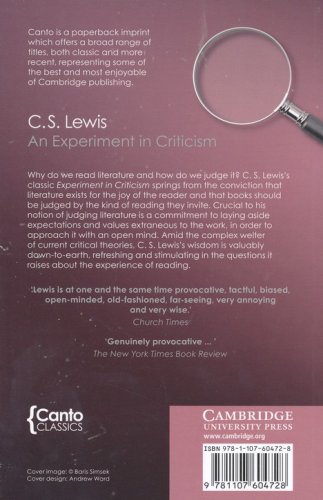 Crucial to his notion of judging literature is a commitment to laying aside expectations and values extraneous to the work, in order to approach it with an open mind. Amid the complex welter of current critical theories, C. S. Lewis's wisdom is valuably down-to-earth, refreshing and stimulating in the questions it raises about the experience of reading.