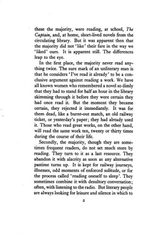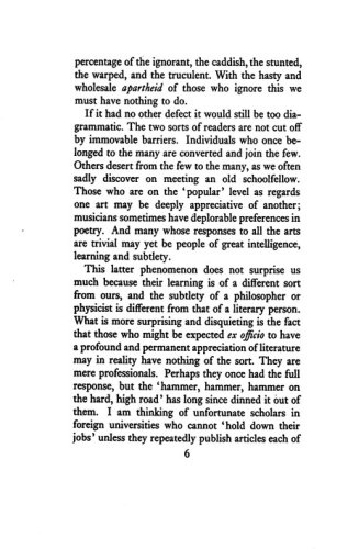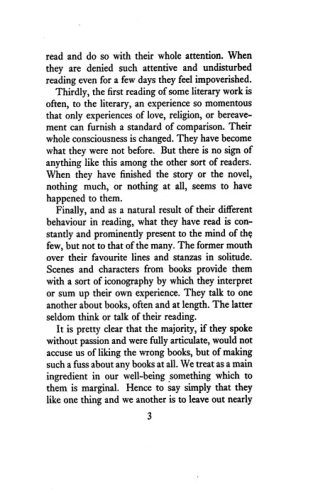 He argues that 'good reading', like moral action or religious experience, involves surrender to the work in hand and a process of entering fully into the opinions of others: 'in reading great literature I become a thousand men and yet remain myself'.