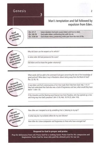 * To help make the Scripture relevant  to daily life.    * To challenge the user to learn the great doctrines of the Bible by searching other Scriptures.   The lessons are divided into five parts:    * The Outline Section gives a bird's-eye view of each Bible chapter's content.    * The Context Questions help the user understand the section in greater detail by honing in on points that are often missed.