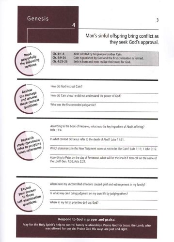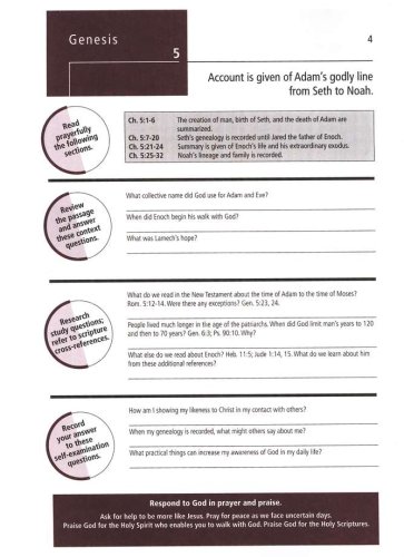 * The Research Study Questions challenge the user to search the Scriptures for answers, comparing one Scripture with another Scripture.    * The Self-Examination Questions put the context of the Bible into a more practical form.    * The Prayer and Praise Section allows for a time of quiet heart-searching in which readers are encouraged to talk to God and contemplate the lessons of the study. The aim of Following God Through the Bible: An Overview of the Old Testament  is to open up the Word of God. The questions asked are just the tool for understanding, the answers are where the rubber meets the road.