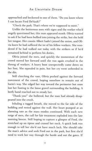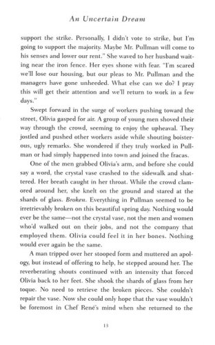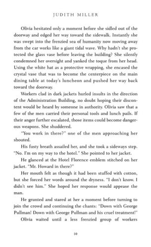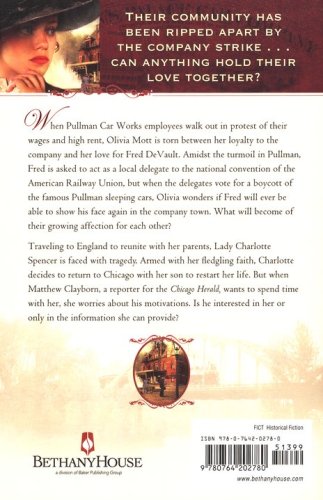 When Pullman Car Works employees walk out in protest of their wages and high rent, Olivia Mott is torn between her loyalty to the company and her love for Fred DeVault. Amidst the turmoil in Pullman, Fred is asked to act as a local delegate to the national convention of the American Railway Union, but when the delegates vote in favor of a nationwide boycott of the famous Pullman sleeping cars, Olivia wonders if Fred will ever be able to return to the company town. What will become of their growing affection for each other? Who will prevail in the company strike?
