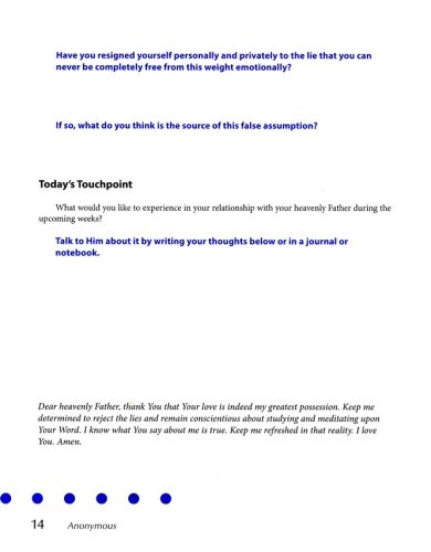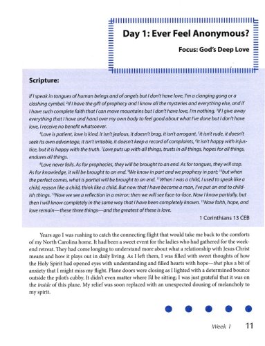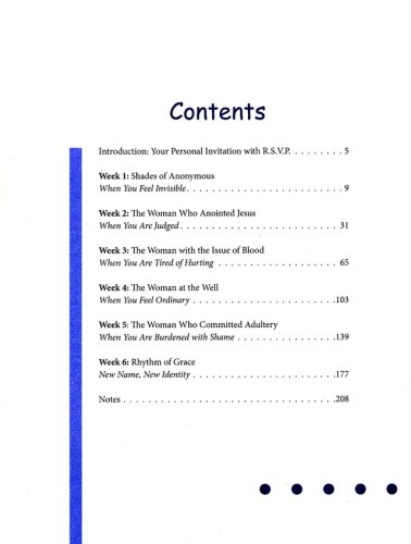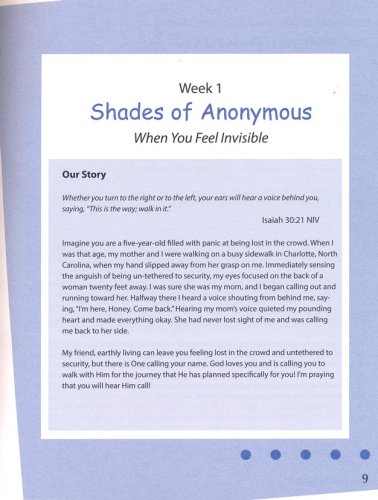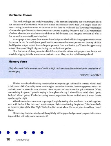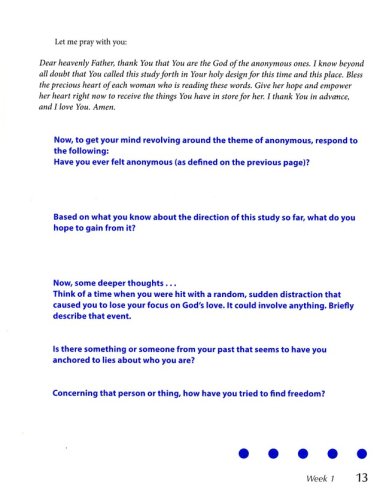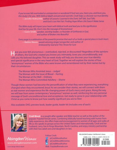 Anonymous helps women discover their uniqueness and significance to Christ by exploring some of the "anonymous" women of the Bible. Though we do not know their names, they all were known and loved by God. Each week of this six-session study begins with an overview of the anonymous woman’s story, including background material with relevance to the cultural lifestyles and surroundings of the day. The daily lessons explore her story and the ways that all women can relate to her. Contemporary “anonymous” stories and quotes from everyday women are sprinkled throughout, reinforcing the very personal relevance of this powerful study. Together women will explore and grow in their relationship with Christ as they find their significance in the heart of God.