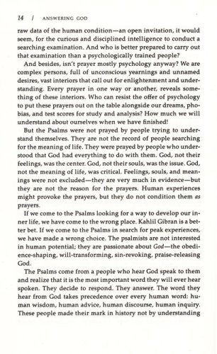 Eugene H. Peterson speaks to Christians who realize the necessity for prayer and yearn for it but who find their prayer unconvincing and unsatisfying. Addressing the causes of this dissatisfaction, Answering God offers guidelines for using the Psalms as dynamic tools for prayer.