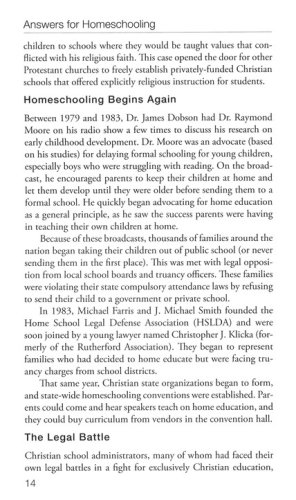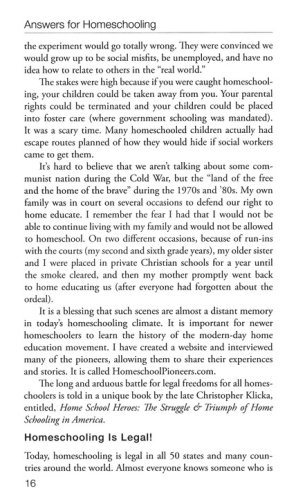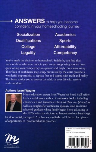 Answers for Homeschooling: Top 25 Questions Critics Ask will help to equip you to have confidence in your decision to home educate and to prepare you to depend your choice to the skeptics you'll surely face at one point or another! Besides from the stranger in the grocery store you might even have well-meaning friends and relatives who may believe you are going to "ruin your child." Learn how to respectfully defend your choice to those who disagree with you with chapters on the legality of homeschooling, whether you're qualified to teach your child, how you can afford to homeschool, if homeschooling is elitist, what about high school and college, and more. 187 pages, softcover.