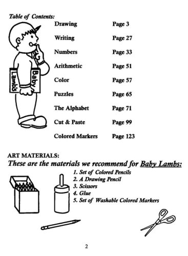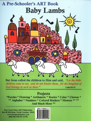 This integrated art book is so much more than just a coloring supplement. Baby Lambs teaches math, color, alphabet, numbers, Bible, visual skills and more, along with including stories and puzzles. Over 45 lesons are given, all in a fun and engaging manner that kids are sure to love. 128 pages, plus five coloring "marker cards." For preschoolers.