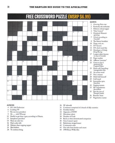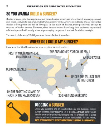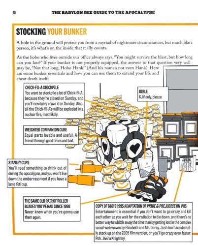 This book includes literally everything you need to prep for the apocalypse including the following: Handy attack moves to fight off zombies, commies, and other brainless monsters Easy bunker construction guides so you can get started building your own apocalypse safe space today Interior decorating tips that will wow any guests into your 50-story underground nuclear silo Weapon assembly DIY guides on how to put together the very best tools for fighting off all kinds of post-apocalyptic horrors Reports from the multiverse where we have a reporter on the ground telling you how the world ends in every possible universe Attractive infographics and charts on every page that even YOU can understand Helpful financial tips for what kind of currency and precious metals to hoard for the end of the world Funny stick figures While other books just tell you that we’re doomed and the collapse of Western Civilization is imminent, only The Babylon Bee Guide to the Apocalypse gives you the tools you need to survive it. If you don’t buy a copy, it’s not like it’s the end of the world. OH WAIT—IT IS.