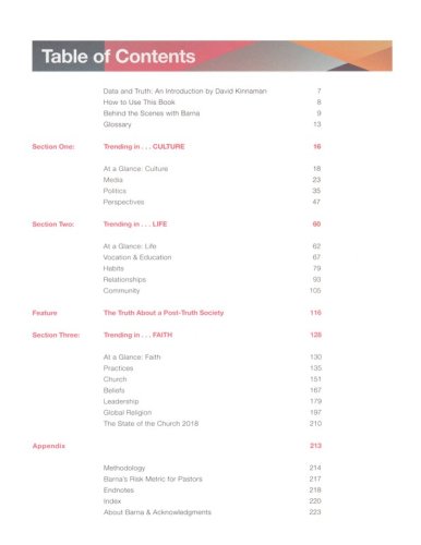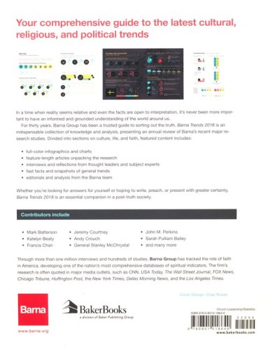 Presenting a year's worth of major research findings, Barna Trends 2018 puts essential information at our fingertips by consolidating and interpreting the raw data behind cultural, religious, and political shifts. Writers, speakers, pastors, and leaders will find this collection of infographics, analysis, and expert commentary indispensable as they prepare to engage audiences, whether on paper, in person, or with pixels.