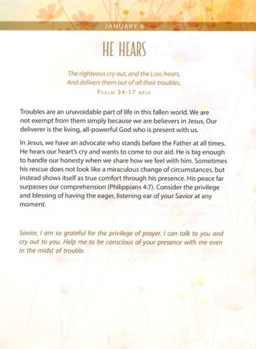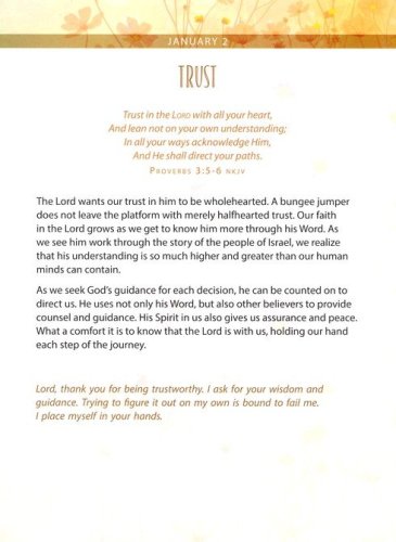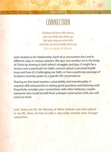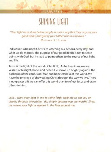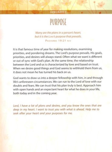 As you read these devotions and Scriptures, be inspired to live with gratitude in your heart and praise on your lips. Meditate on things that produce life and peace. Evaluate each day in the light of God's truth and stand in awe of a heavenly Father who gives abundantly more than you can ask or imagine. As you quiet yourself before him, experience the goodness of his presence and be refreshed with his life-giving joy.