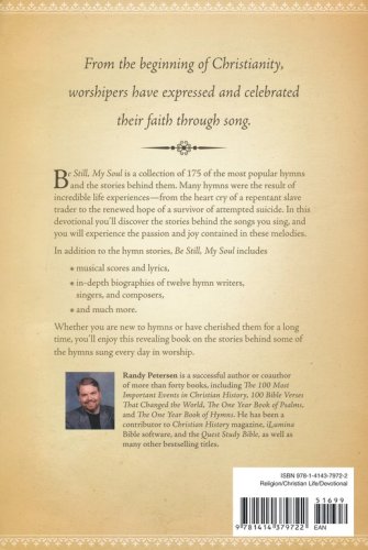 Be Still, My Soul is a collection of 175 of the most popular hymns and the stories behind them. Many of these hymns were written out of incredible life experiences—from the heart cry of a repentant slave trader to the renewed hope of a survivor of attempted suicide. In this devotional you’ll discover the stories behind the songs we sing. You’ll experience the passion and joy contained in these hymns’ lyrics and melodies. In addition to the hymn stories, Be Still, My Soul includes the musical score, lyrics, and in-depth biographies of 12 of the most-prolific hymn writers, singers, and composers.