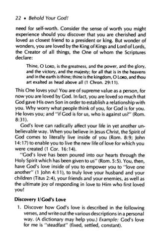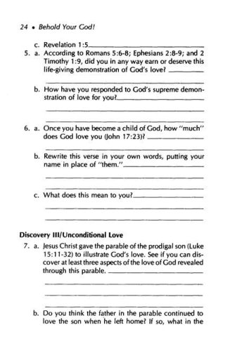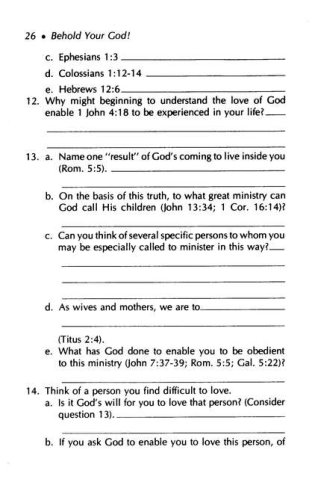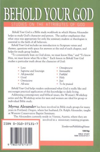 Behold Your God is a Bible study workbook in which Myrna Alexander helps us study God's character and person. The author emphasizes that what once was appropriate for only the seminary student or theologian is essential to the faith of all believers. Behold Your God includes an introduction to Scripture verses and themes, questions with space for answers at the end of each chapter, and helps for study group leaders. "To consistently lean on God alone, we must know Him," and "To know Him, we must know what He is like." Each lesson in Behold Your God studies a particular truth about the character of God: – Love – Supreme and Sovereign – All-powerful – Good – Omniscient – All-wise – Omnipresent – Immutable – Faithful – Holy – Just – To be praised — Behold Your God helps readers understand what God is really like and encourages practical application of this knowledge to daily living. Addressing contemporary and biblical issues, the Woman's Workshop series and the Workshop series for men and women are ideal for group or individual Bible study.