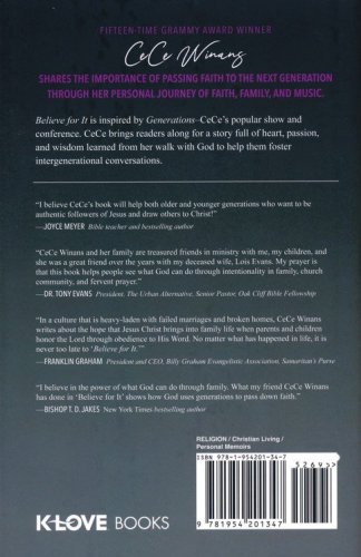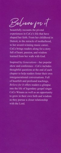 Believe for It: Passing on Faith to the Next Generation beautifully recounts the pivotal experiences in CeCe's life that have shaped her faith. From her childhood in Detroit and the miracle of motherhood to her award-winning music career, CeCe brings readers along for a story full of heart, passion, and wisdom acquired from her walk with God.
