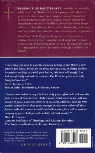This fully revised edition includes: A new organization for the Office of Vigils, structured on a two-week cycleDaily Offices also arranged on a two-week cyclePatristic readings for each SundayConcluding prayers for the daily and seasonal officesA more user-friendly layoutBenedictine Daily Prayer is designed for Benedictine oblates, Benedictine monastics, and men and women everywhere. Small enough to fit in a briefcase for travel, it is arranged by date. Scripture readings are from the NRSV.