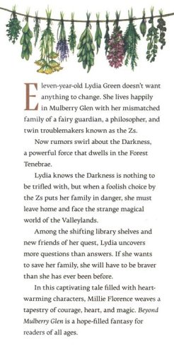 Eleven-year-old Lydia Green lives contentedly in the tiny village of Mulberry Glen with her delightfully mismatched family: her fairy guardian, a philosophical uncle, and the twin pranksters known as the Zs. But when a careless act awakens the ancient threat of the Darkness from the forest of Tenebrae, Lydia’s peaceful world is turned upside down. To protect the ones she loves, Lydia must venture into the enchanted Valleylands, where shifting library shelves and curious companions guide her journey. As mysteries deepen and the stakes grow higher, Lydia discovers that even the smallest light can shine in the darkest places. 288 pages, hardcover with dustjacket. Ages 8 -12.