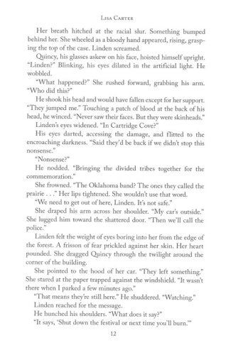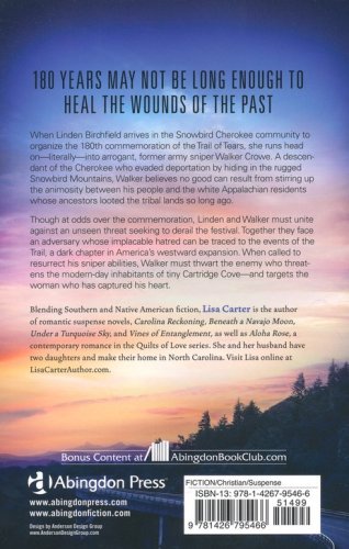 When Linden Birchfield arrives in the Snowbird Cherokee community to organize the 180th commemoration of the Trail of Tears, she runs head on—literally—into arrogant former army sniper Walker Crowe. A descendant of the Cherokee who evaded deportation by hiding in the rugged Snowbird Mountains, Walker believes no good can result from stirring up the animosity with the white Appalachian residents whose ancestors looted the tribal lands so long ago. Though at odds over the commemoration, Linden and Walker must unite against an unseen threat to derail the festival. Together they face an enemy whose implacable hatred can be traced to the events of the Trail, a dark chapter in America’s westward expansion. When called to resurrect his sniper abilities, Walker must thwart the enemy who threatens the modern-day inhabitants of tiny Cartridge Cove—and targets the woman who has captured his heart.