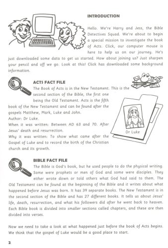 The Bible Detectives, Harry, Jess, and Click the mouse, are on the case – ready to investigate… but they need your help! Are you ready? With the help of their computer, faxes and modems The Bible Detectives are ready to get to grips with this mystery… but there is one important piece of equipment they need! God's word – the Bible.