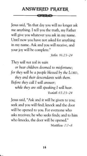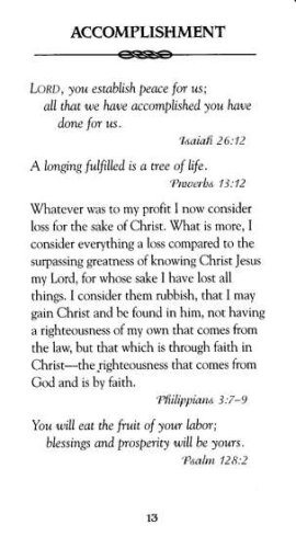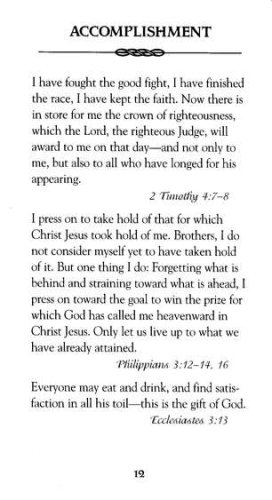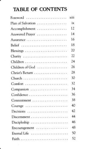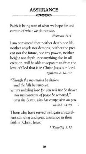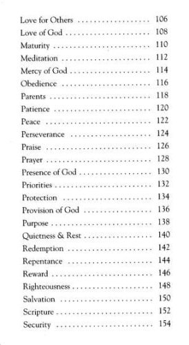 short Scripture readings from the New International Versionverse selections for relevant, real-life topics, including finances, children, love, contentment, self-worth, and forgiveness"The Plan of Salvation" by Billy Graham and a foreword by Joni Eareckson Tadaa small and lightweight design perfect for carrying with you or keeping on a nightstandtextured softcover