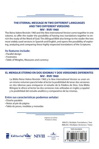 Un mensaje idéntico en dos idiomas diferentes y dos traducciones diferentes en la New International Version y la Biblia RVR 1960. La versión en español de  Reina Valera Revisión 1960 y la New Internacional Version son unidas por primera vez en un solo volumen, que le da la oportunidad de tener dos traducciones en dos idiomas para un estudio más rico de la Palabra de Dios.