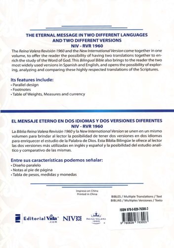 The Spanish Reina Valera 1960 Revision and the English New International Version are for the first time in history united in one single volume, giving the reader an opportunity of having two translations in two languages for a richer study of the Word of God.