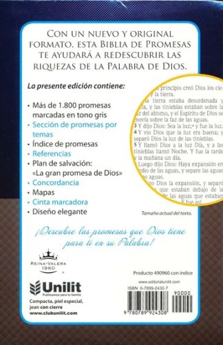 Now in compact format, The Compact Promises Bible contains more than eighteen hundred promises from God to bless us, encourage us and instruct us, marked in gray to facilitate consultation. This edition is perfect for its size and affordable price. The compact Promises Bible is found in the Reina Valera version of 1960, which is the most classic and acclaimed among millions of people in Spanish-speaking countries around the world.