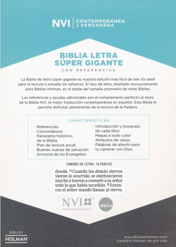 The Super Giant Print Bible is our easiest to read. It is ideal for an effortless Bible reading or study. The typeface, exclusively designed for Biblias Holman, is twice the average size of other Bibles. The references and additional tools are the perfect complements to the NVI Bible text, the best contemporary translation in Spanish. This Bible allows you fully enjoy the reading of the Word.