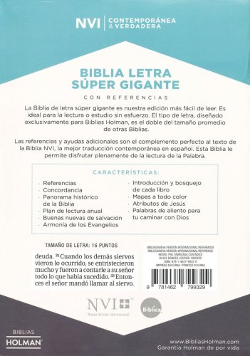 La Biblia de letra súper gigante es nuestra edición más fácil de leer. Es ideal para la lectura o estudio sin esfuerzo. El tipo de letra, diseñado exclusivamente para Biblias Holman, es el doble del tamaño promedio de otras Biblias. Las referencias y ayudas adicionales son el complemento perfecto al texto de la Biblia NVI, la mejor traducción contemporánea en español. Esta Biblia le permite disfrutar plenamente de la lectura de la Palabra.