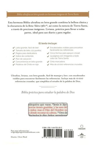 Letra grande de 12.5 puntos, que facilita la lecturaConcordancia en letra grande de 11 puntosPalabras de Cristo en rojoEncabezados visibles para encontrar fácilmente las referenciasMás de 10,000 referencias cruzadasPlan de salvación16 páginas con imágenes a todo color de Tierra SantaCinco formas cristianas de apoyo a Israel