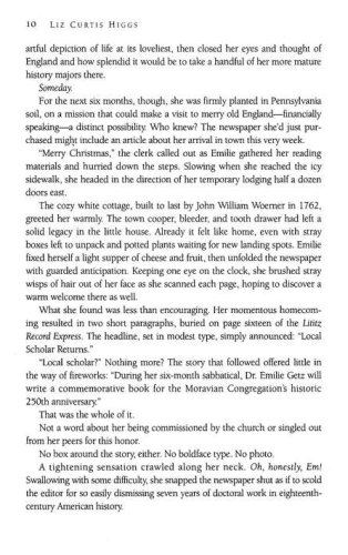 Though she has traveled the world, Liz Curtis Higgs is a small-town girl at heart. In Bookends, Liz invites readers to visit a place she knows well: her hometown of Lititz, nestled in the rolling hills of historic Lancaster County , Pennsylvania . Fond memories of her childhood years in the Moravian church—one of the oldest of the Protestant denominations—and her love for Lititz history and traditions serve as a solid underpinning for this lively contemporary tale. Like many couples, Emilie and Jonas resemble human bookends—opposites in every way—until Emilie’s joy-filled spiritual awakening turns their stubborn hearts in the same happy direction.