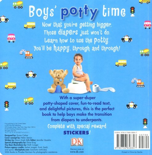Filled with images of real children using the potty, Potty Time Books are new shaped board books, with their padded potty-seat covers, make toilet training fun for toddlers. Boy's Potty Time and Girl's Potty Time help little ones learn how to use the potty by following the example of the boys or girls in each book.