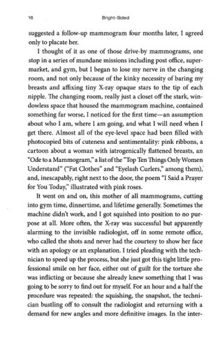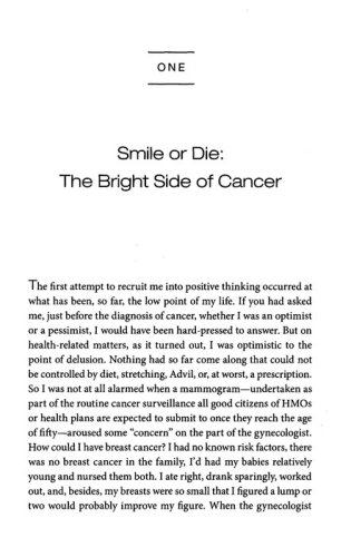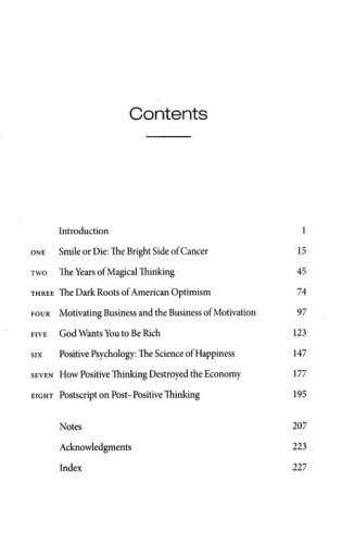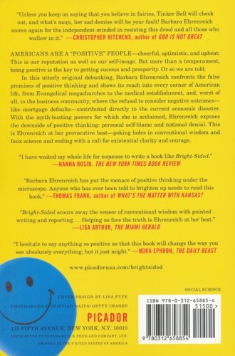 In this utterly original debunking, Barbara Ehrenreich confronts the false promises of positive thinking and shows its reach into every corner of American life, from Evangelical megachurches to the medical establishment, and, worst of all, to the business community, where the refusal to consider negative outcomes–like mortgage defaults–contributed directly to the current economic disaster. With the myth-busting powers for which she is acclaimed, Ehrenreich exposes the downside of positive thinking: personal self-blame and national denial. This is Ehrenreich at her provocative best–poking holes in conventional wisdom and faux science and ending with a call for existential clarity and courage.