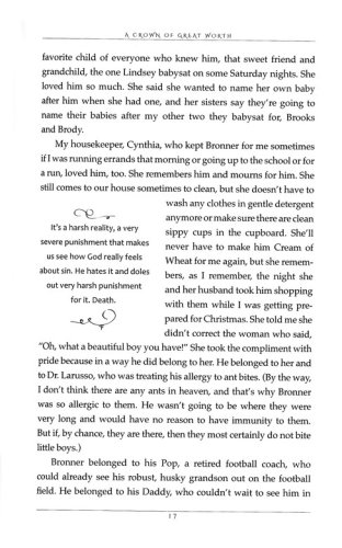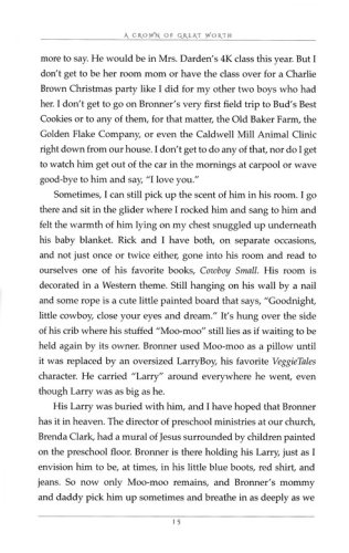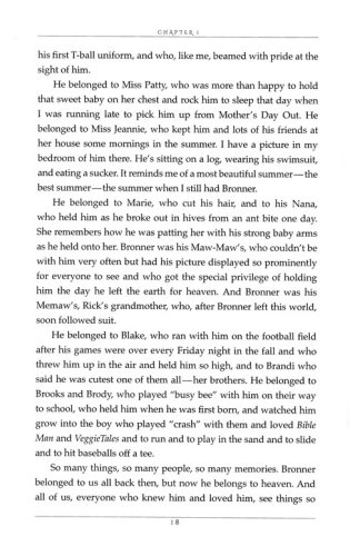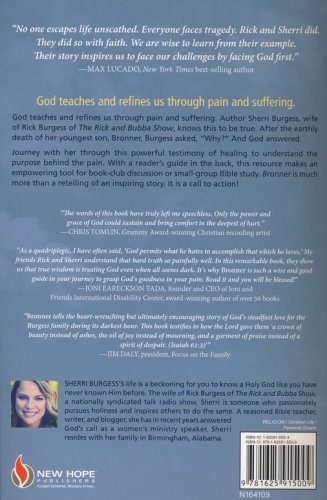 From the opening paragraph to the final page, author Sherri Burgess's miraculous story helps us understand more about how only a holy God can save a soul and change the course of a life. Her own journey vividly shares how God teaches and refines us-through joy, pain, and His power made perfect in our weakest moments, when we would otherwise give up. Author Sherri Burgess, wife of Rick Burgess of The Rick and Bubba Show, knows this to be true. After the earthly death of her youngest son, Bronner, Burgess asked, Why?! And God answered.