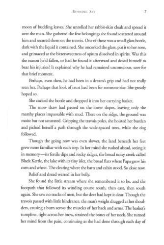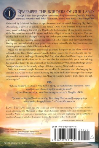 Abducted by Mohawk Indians at fourteen and renamed Burning Sky, Willa Obenchain is driven to return to her family’s New York frontier homestead after many years building a life with the People. At the boundary of her father’s property, Willa discovers a wounded Scotsman lying in her path. Feeling obliged to nurse his injuries, the two quickly find much has changed during her twelve-year absence: her childhood home is in disrepair, her missing parents are rumored to be Tories, and the young Richard Waring she once admired is now grown into a man twisted by the horrors of war and claiming ownership of the Obenchain land.