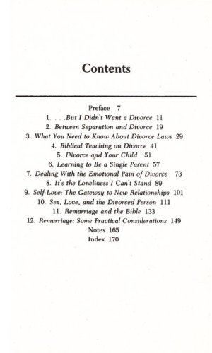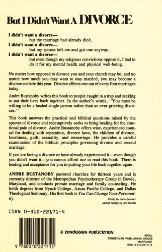 I didn't want a divorce — but the marriage had already died. I didn't want a divorce — but my spouse left me and got one anyway. I didn't want a divorce — but even though my religious convictions opposed it, I had to do it for my mental health and physical well-being. No matter how opposed to divorce you and your church may be, and no matter how much you may want to stay married, you may become a divorce statistic this year. Divorce affects one out of every four marriages today. Andre Bustanoby writes this book to people caught in a trap and seeking to put heir lives back together. In the author's words, "You must be willing to be a healed single person rather than an ever-grieving divorcee." This book answers the practical and biblical questions raised by the specter of divorce and redemptively seeks to bring healing for the emotional pain of divorce. Andre Bustanoby offers wise, experienced counsel for dealing with separation, divorce laws, the children of divorce, loneliness, guilt, sexuality, and remarriage. He provides a careful examination of the biblical principles governing divorce and second marriage. If you are facing a divorce or have already experienced it — even though you didn't want it — you cannot afford not to read this book. There is healing and acceptance for you in putting your life back together again.