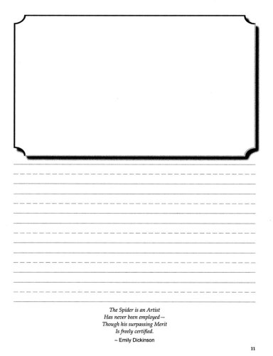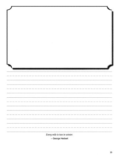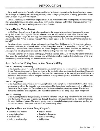 Each journal page provides a half-page space for writing with large center-dashed lines for neat penmanship. Students may write their own observations, or parents can create simple copywork sentences from spoken words.When all sentences are recorded on the page, whether dictated, copied, or written, the teacher or student then reads the words aloud. The top half of the page contains a space for students to draw their illustration. A quote is included at the bottom of the page.