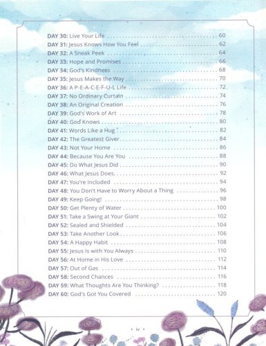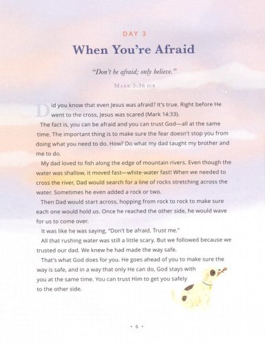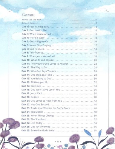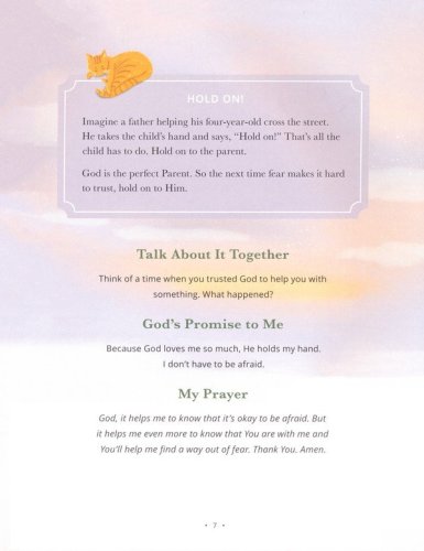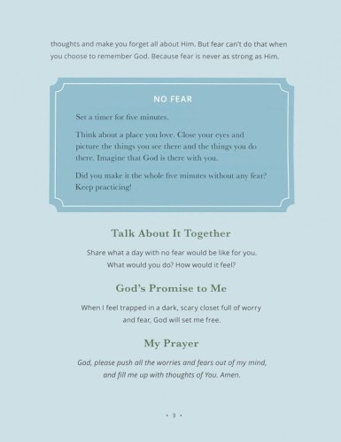 Bible verses,comforting artwork,short devotions with kid-friendly analogies,a quick-reference list of God's promises, andthoughtful practices and questions to encourage conversation between you and your children and to help them release their anxieties one by one, breath by breath, into the safe hands of God.