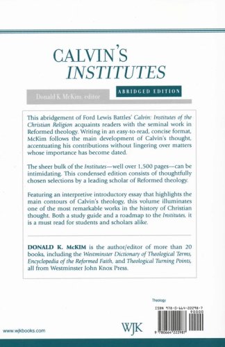 This abridgement of Ford Lewis Battles' Calvin: Institutes of the Christian Religion will better acquaint readers with the seminal work in Reformed theology. In an easy-to-read, concise format, Donald McKim follows the main development of Calvin's thought, accentuating his contributions without lingering over matters whose importance has become outdated.
