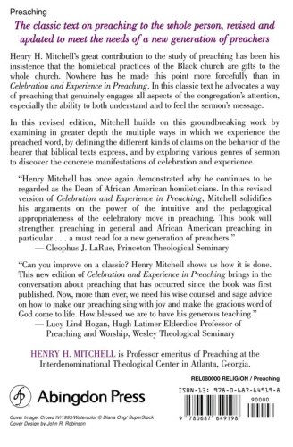 Henry H. Mitchell's great contribution to the study of preaching has been his insistence that the homiletical practices of the Black church are gifts to the whole church. Nowhere has he made this point more forcefully than in Celebration and Experience in Preaching. In this classic text he advocates a way of preaching that genuinely engages all aspects of the congregation's attention, especially the ability to both understand and to feel the sermon's message.