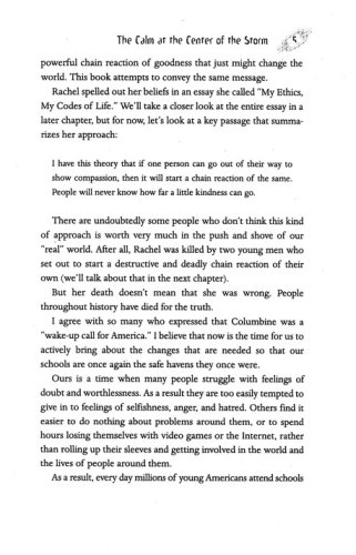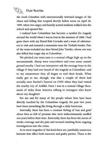 Rachel Scott and her killer Eric Harris both talked about starting a "chain reaction." Eric used violence to kill and destroy at Columbine High School. But Rachel chose another path. In a personal creed she wrote one month before her death in the Columbine tragedy, she explained her conviction that if one person goes out of his or her way to show compassion, it will start a world-changing chain reaction ofkindness.