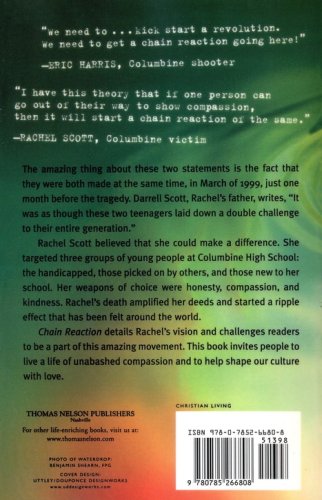 For Rachel, this was a solemn calling. And now her father, Darrell Scott, is carrying on her crusade by challenging people of all ages to commit themselves to creating a revolution of compassion that can make a real difference in our troubled world. Chain Reaction spells out this challenge in compelling detail, providing moving examples of practical compassion and giving illustrations from Rachel's life and journals.