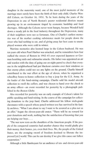 Charles Colson has become one of the most revered leaders of our time. His ministry outreach, Prison Fellowship, has swelled to 40,000 volunteers working in 100 countries. His Angel Tree Christmas program provides presents to more than half a million children of prison inmates every year. His daily radio broadcast, BreakPoint, airs daily on more than 1,000 radio outlets across the country. And his twenty books have sold more than five million copies in the U.S.