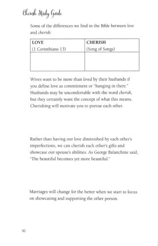 The Cherish Study Guide includes video discussion questions, Bible exploration, and personal study and reflection materials for in-between sessions.