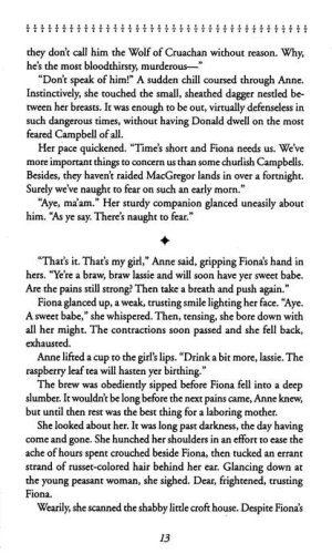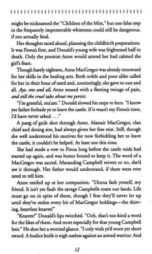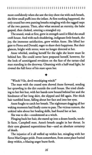 While Niall wrestles with his suspicions about a traitor in his clan, Anne's actions do not go unnoticed. And as accusations of witchcraft abound, the strong and sometimes callous Campbell heir must fight for Anne's safety among disconcerted clan members. Meanwhile his own safety in threatened with the ever-present threat of someone who wants him dead.